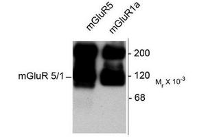 - The metabotropic glutamate receptors (mGluRs) are key receptors in the modulation of excitatory synaptic transmission in the central nervous system. They are implicated in many forms of neural plasticity as well as learning and memory and drug abuse (Bhattacharya et al., 2004, Francesconi et al., 2004, Wilson and Nicoll, 2001). Group I metabotropic glutamate receptors (consisting of mGluR1 and mGluR5) are G-protein-coupled neurotransmitter receptors that are localized in the perisynaptic region of the postsynaptic membrane. When activated, Group I mGluRs lead to stimulation of phospholipase and activation of Protein Kinase C. In contrast, activation of Group II metabotropic receptors (mGluR2 and mGluR3) leads to inhibition of adenylate cyclase. The mGluR1 receptor may also be critically involved in limiting the deleterious effects of excitotoxicity (Blaabjerg et al., 2003). In contrast, the mGluR5 receptor appears to be essential for late phase LTP in area CA1 of the hippocampus (Francesconi et al., 2004).Synonyms: GRM1A, GRM5, MGLUR1a, MGLUR5, Metabotropic Glutamate Receptor 5/1a