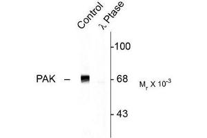 - This antibody recognizes the ~68k to ~70k PAK protein phosphorylated at Thr402. The immunolabeling of PAK is completely eliminated by lambda-phosphatase treatment.