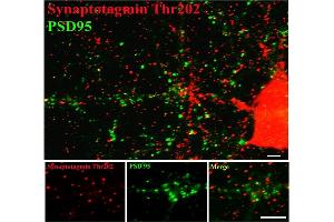 This antibody recognizes the ~60k-62k synaptotagmin protein phosphorylated at Thr202 in Western Blots of Rat brain lysate. The immunolabeling is completely eliminated by lambda-phosphatase treatment.