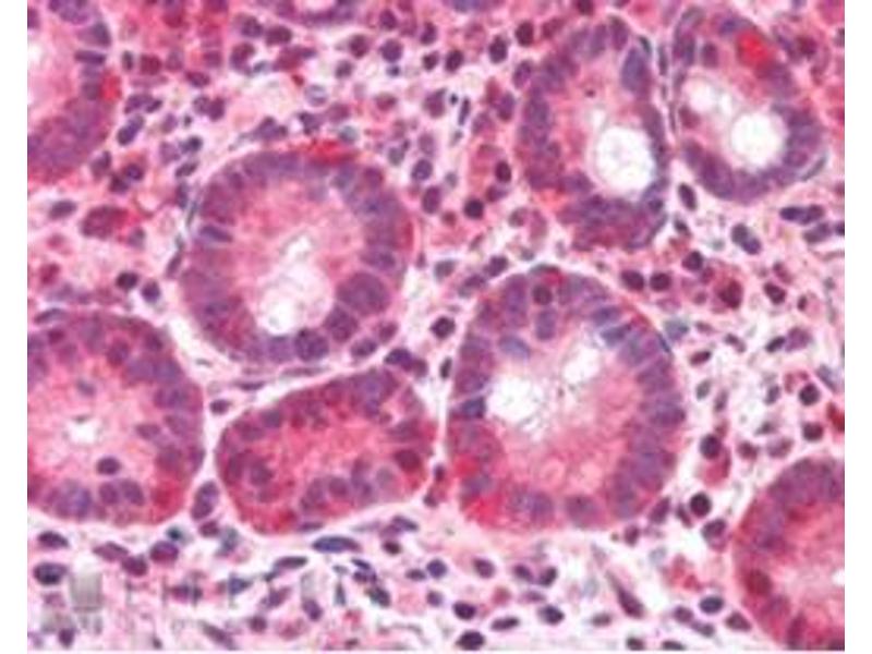 Peptide ELISA: Limit dilution 1: 4000. Western blot: Preliminary experiments gave an approx 35 kDa band in Testis and Brainlysates after 0.3 μg/mL antibody staining. Please note that currently we cannot find anexplanation in the literature for the band we observe given the calculated size of 225 kDaaccording to NP_038478. The 35 kDa band was successfully blocked by incubation with theimmunizing peptide. We would appreciate any feedback from people in the field - have anyresults been reported with other antibodies/lysates? Have any further splicevariants/modified forms been reported?Immunohistochemistry: 1-2 μg/mL. In paraffin embedded Human Small Intestine showsprimarily nuclear staining in a number of cells of the lamina propria.