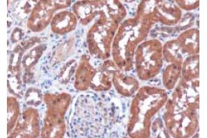 Peptide ELISA: 1/32000. Western Blot: 0.1 - 0.3 μg/mL. Immunohistochemistry on paraffin sections: 3 μg/mL.