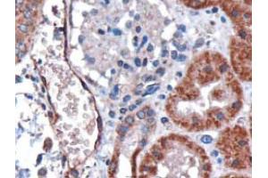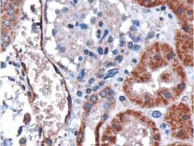 Peptide ELISA: Detection Limit: 1/16000. Western Blot: 0.1-0.3 μg/mL. Approx 35 kDa band observed in human kidney and humanliver lysates (calculated MW of 35.5 kDa according to NP_002027.2). Immunohistochemistry: 3 μg/mL. In paraffin embedded human kidney, stains epithelialcells of renal tubules and endothelial cells of vessels. The granular staining is compatiblewith the endoplasmic reticulum association of the protein. This antibody has also beensuccessfully used on Huamn Lung showing endothelial staining. FACS: A customer has reported Successful staining of HEK293S-TetR transfected with DARCreceptor at a dilution of 1/1000.