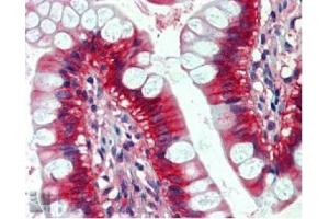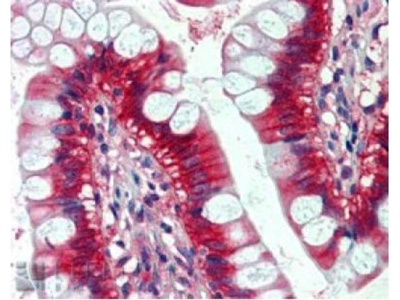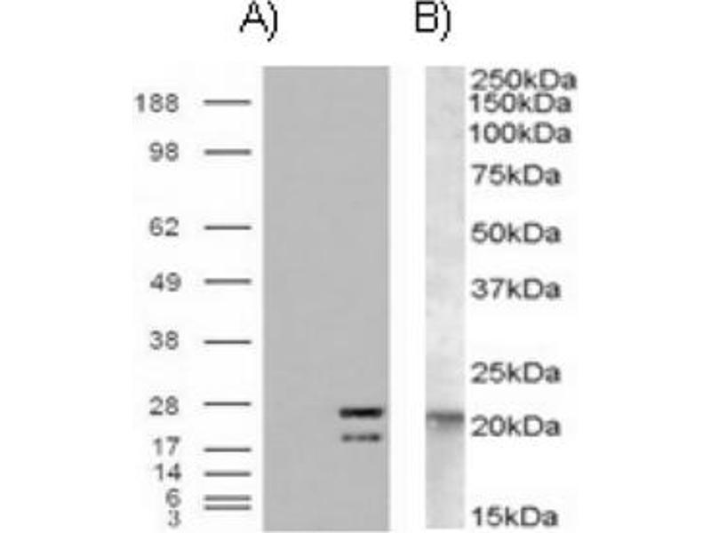 Peptide ELISA: Antibody detection limit dilution 1/32000. Western Blot: 0.01-0.03 μg/mL. Approx.21 kDa band observed in Human lysates of cell lineA431. In transfected HEK293 transiently expressing NRAS bands of approx.21 kDa and21 kDa are observed. These bands are not observed in the non-transfected HEK293. Immunohistochemistry: 2-3 μg/mL. In paraffin embedded Human Small Intestine shows stainingof cytoplasm and membrane of enterocytes.