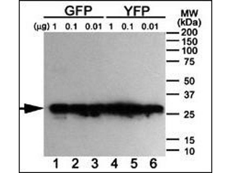 - Green fluorescent protein (GFP), originally isolated from the jellyfish Aequorea victoria, is one of the best visual reporters for monitoring gene expression in vivo and in situ. GFP is a also convenient marker for use in flow cytometry because it eliminates the need to incubate with a secondary reagent (such as dyes or antibodies) for detection. However, anti-GFP antibody is also widely used for co-immunipreciapitation, co-localization or western blotting for the confirmation of specificity when a GFP fusion protein is expressed in cells. Abgent's anti-GFP monoclonal antibody provides a simple solution to detect the expression of a GFP-tagged protein in cells. Because of its ability to spontaneously generate its own fluorophore, the green fluorescent protein (GFP) from the jellyfish Aequorea victoria is used extensively as a fluorescent marker in molecular and cell biology. The yellow fluorescent proteins (YFPs) have the longest wavelength emissions of all GFP variants examined to date. This shift in the spectrum is the result of a T203Y substitution (single-letter amino acid code), a mutation rationally designed on the basis of the X-ray structure of GFP S65T. Abgent's anti-GFP monoclonal antibody can detect both GFP and YFP but not BFP (Blue fluorescent protein) by western blotting.