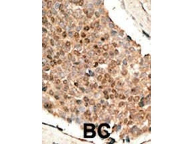 This Bmp10 antibody is generated from rabbits immunized with a KLH conjugated synthetic peptide between 7-35 amino acids from the N-terminal region of human Bmp10.