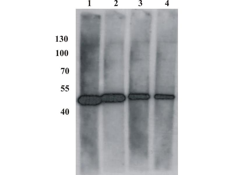 - Westernblot: 1/500 – 1/2000. Immunofluorescence: 1/1000. Immuniprecipitation. Antibody working titer has to be established practically for each particular antigen and assay format