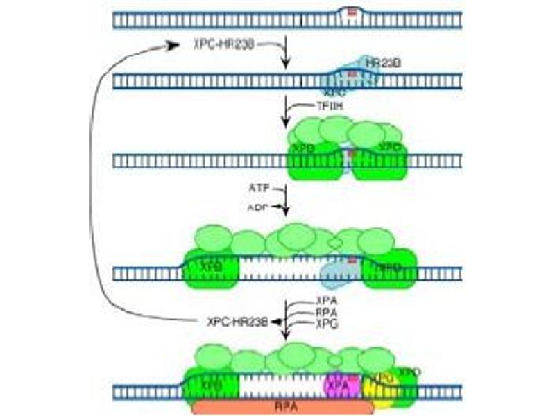 HR23B (also known as UV excision repair protein RAD23 homolog B, XP-C repair complementing complex 58 kDa protein and p58) is one of two human homologs of Saccharomyces cerevisiae Rad23 (hHR23A and hHR23B), a protein involved in nucleotide excision repair (NER). This protein was shown to interact with, and elevate the nucleotide excision activity of 3-methyladenine-DNA glycosylase (MPG), which suggested a role in DNA damage recognition in base excision repair. This protein contains an N-terminal ubiquitin-like domain, which was reported to interact with 26S proteasome, as well as with ubiquitin protein ligase E6AP, and thus suggests that this protein may be involved in the ubiquitin mediated proteolytic pathway in cells.Synonyms: HR23B, UV excision repair protein RAD23 homolog B, XP-C repair-complementing complex 58 kDa protein