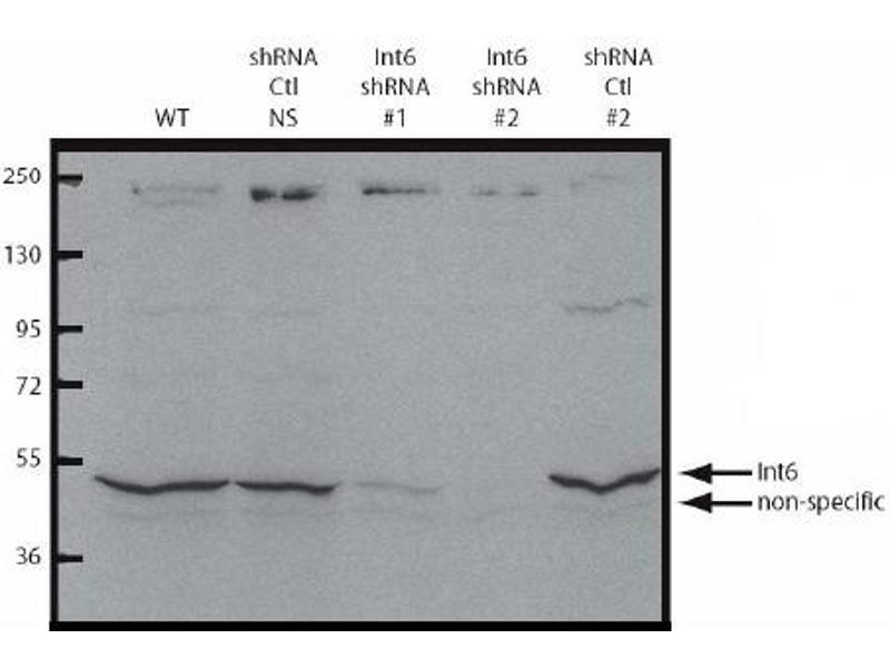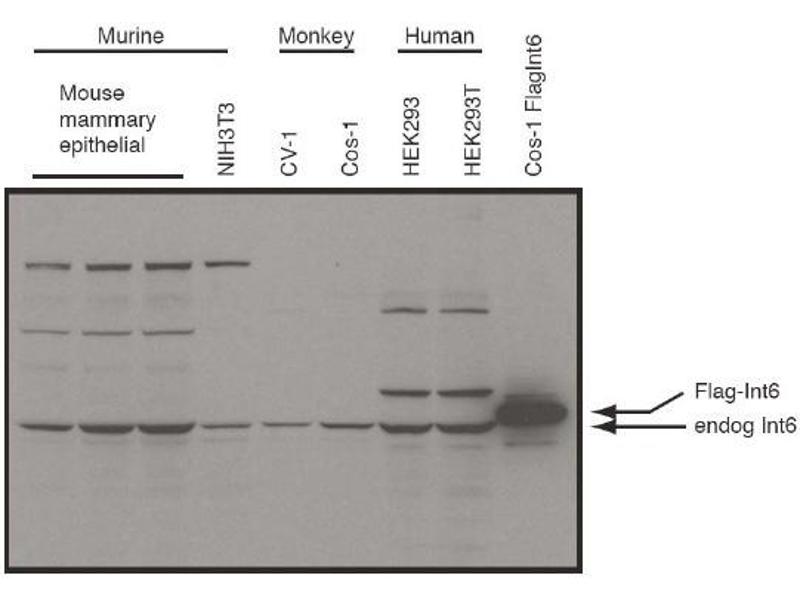 - Int6 is a candidate tumor suppressor in multiple neoplasms, and in particular, breast and lung cancers. The Int6 locus was initially identified as a common insertion site (CIS) in a genetic screen for transforming sequences in a breast cancer mouse model system. Insertion of mouse mammary tumor virus (MMTV) into this locus results in the production of an amino-terminal truncated gene product. Expression of the truncated Int6 product corresponds to cellular transformation in both in vivo and in vitro systems. This gene product plays a role in regulating translation initiation and is a component of the eIF3 translation initiation complex. There is evidence that suggests that Int6 may impart a negative role in the general translational machinery while promoting an increase in the expression of a subset of stress-responsive genes. Taken together, it is of great interest to further study the mechanism by which Int6 is involved in regulating cell growth.Synonyms: Eukaryotic translation initiation factor 3 subunit 6, Eukaryotic translation initiation factor 3 subunit E, INT6, Viral integration site protein INT-6 homolog, eIF-3 p48