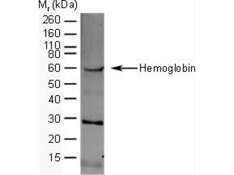 Hemoglobin is a 66 kDa metalloprotein composed of four globular subunits each of which is associated with an iron-containing heme group. The heme group is involved with oxygen transport from the lungs to the tissues and the globin molecule plays a major role in transporting carbon dioxide in the reverse direction. Hemoglobin is found in the erythrocytes of all vertebrates. There is a wide diversity of amino acid sequences and substitutions within mammalian hemoglobins, however the molecular weight is generally around 66 kDa with an iron content of about 0.34 % . The level of hemoglobin in the blood is used in the diagnosis of anemia, levels in the feces are indicative of various clinical conditions. Mutations in the genes for the hemoglobin protein result in a group of hereditary diseases in humans termed hemoglobinopathies, and include sickle-cell disease and thalassemias.Synonyms: Haemoglobin