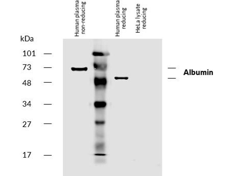 - The mouse monoclonal antibody AL-01 reacts only with human serum albumin, a 65-67 kDa monomeric protein in human blood plasma, it is produced in liver. No cross-reactivity was observed with other serum proteins.
