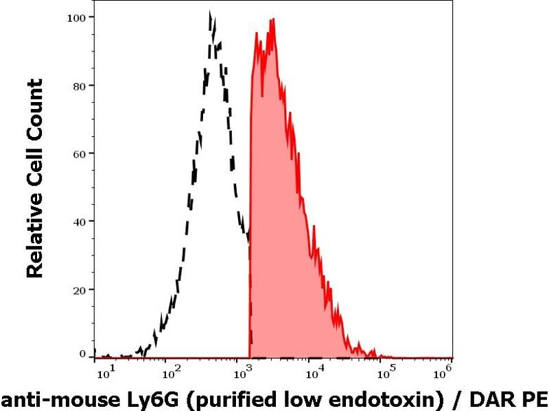 Lymphocyte antigen 6 complex, locus G,Ly6G is a component of the myeloid differentiation antigen Gr-1, together with Ly6C. Ly6G is a good marker for detection of peripheral neutrophils. Expression of Gr-1 in bone marrow correlates with granulocyte differentiation and maturation. Physiological role of Ly6G remains still unclear. Its treatment with antibodies in vivo leads to neutropenia and has inhibitory effect on local immune responses.,Gr1, Gr-1, Ly-6G