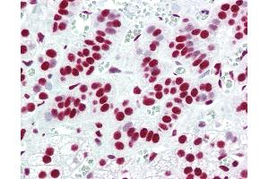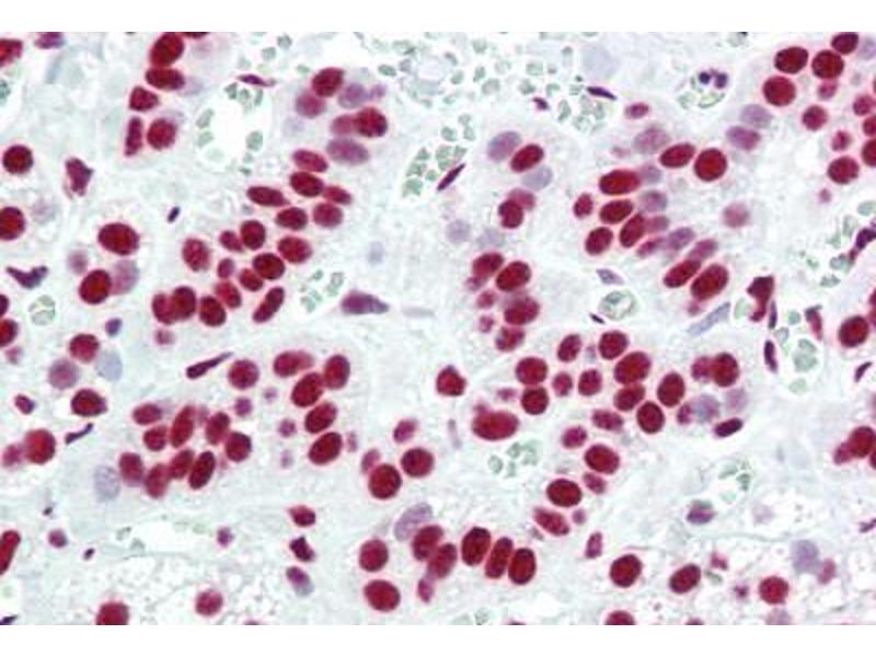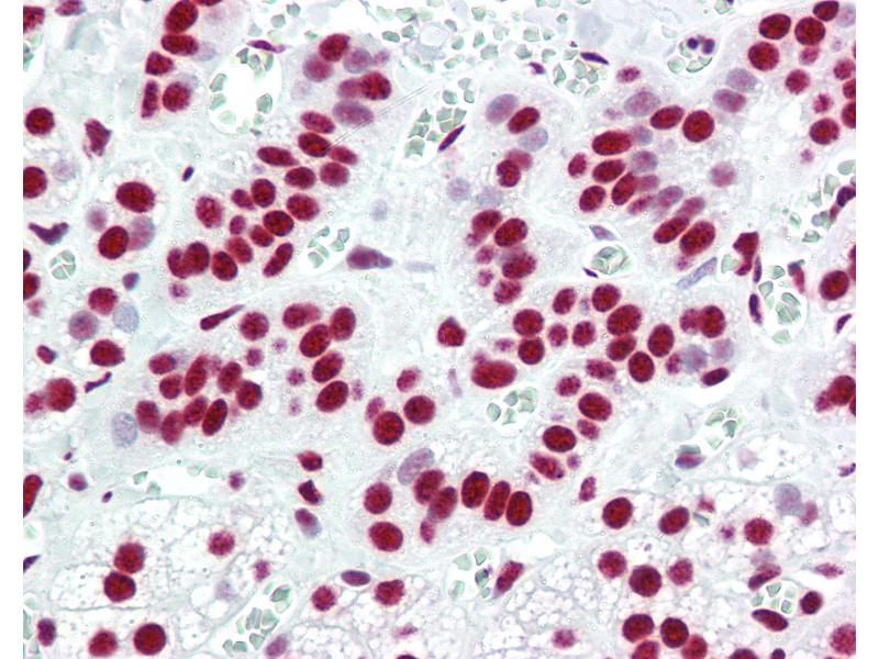 Usage: Immunohistochemistry: This antibody was validated for use in immunohistochemistry on a panel of 21 formalin-fixed, paraffin-embedded (FFPE) human tissues after heat induced antigen retrieval in pH 6.0 citrate buffer. After incubation with the primary antibody, slides were incubated with biotinylated secondary antibody, followed by alkaline phosphatase-streptavidin and chromogen. The stained slides were evaluated by a pathologist to confirm staining specificity. The optimal working concentration for this antibody was determined to be 5 μg/mL. -