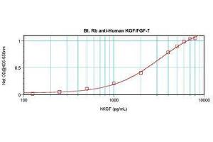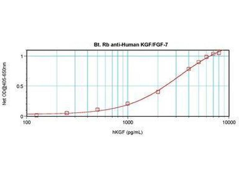 Usage: The applications listed have been tested for the unconjugated form of this product. Other forms have not been tested. ELISA: To detect hKGF by direct ELISA (using 100 μL/well antibody solution) a concentration of 0.25-1 μg/mL of this antibody is required. This biotinylated polyclonal antibody, in conjunction with compatible secondary reagents, allows the detection of at least 0.2-0.4 ng/well of recombinant hKGF. To detect hKGF by sandwich ELISA (using 100 μL/well antibody solution) a concentration of 0.25-1 μg/mL of this antibody is required. This biotinylated polyclonal antibody, in conjunction with Polyclonal Anti-Human KGF (LS-C104693) as a capture antibody, allows the detection of at least 0.2-0.4 ng/well of recombinant hKGF. Western Blot: To detect hKGF by Western Blot analysis this antibody can be used at a concentration of 0.1-0.2 μg/mL. Used in conjunction with compatible secondary reagents the detection limit for recombinant hKGF is 1.5-3 ng/lane, under either reducing or non-reducing conditions. -