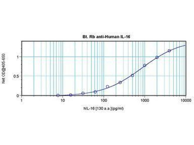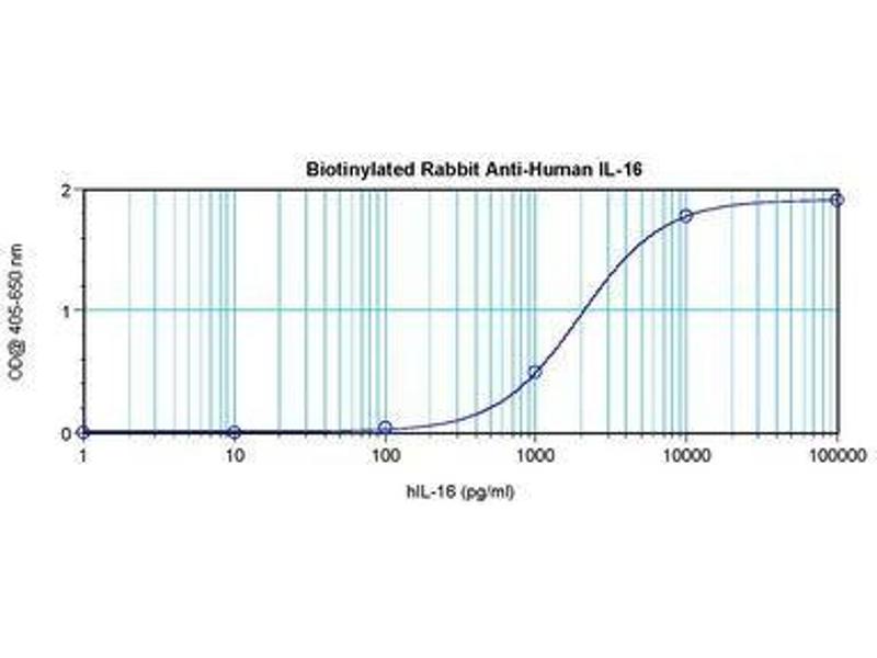 Usage: The applications listed have been tested for the unconjugated form of this product. Other forms have not been tested. ELISA: To detect hIL-16 by direct ELISA (using 100 μL/well antibody solution) a concentration of 0.25-1 μg/mL of this antibody is required. This biotinylated polyclonal antibody, in conjunction with compatible secondary reagents, allows the detection of at least 0.2-0.4 ng/well of recombinant hIL-16. To detect hIL-16 by sandwich ELISA (using 100 μL/well antibody solution) a concentration of 0.25-1 μg/mL of this antibody is required. This biotinylated polyclonal antibody, in conjunction with Polyclonal Anti-Human IL-16 (LS-C104445) as a capture antibody, allows the detection of at least 0.2-0.4 ng/well of recombinant hIL-16. Western Blot: To detect hIL-16 by Western Blot analysis this antibody can be used at a concentration of 0.1-0.2 μg/mL. Used in conjunction with compatible secondary reagents the detection limit for recombinant hIL-16 is 1.5-3 ng/lane, under either reducing or non-reducing conditions. -