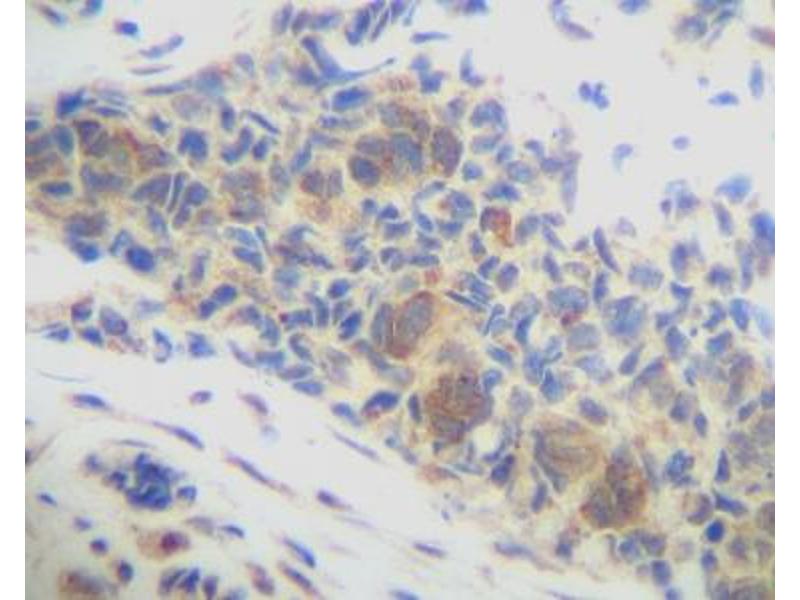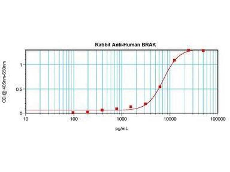 Usage: Immunohistochemistry: This antibody stained formalin-fixed, paraffin-embedded sections of human breast invasive ductal carcinoma. The recommended concentration is 0.25 μg/mL with an overnight incubation at 4 °C. An HRP-labeled polymer detection system was used with a DAB chromogen. Heat induced antigen retrieval with a pH 6 sodium citrate buffer is recommended. Optimal concentrations and conditions may vary. ELISA: To detect hBRAK by sandwich ELISA (using 100 μL/well antibody solution) a concentration of 0.5-2 μg/mL of this antibody is required. This antigen affinity purified antibody, in conjunction with Biotinylated Anti-Human BRAK (LS-C104495) as a detection antibody, allows the detection of at least 0.2-0.4 ng/well of recombinant hBRAK. Western Blot: To detect hBRAK by Western Blot analysis this antibody can be used at a concentration of 0.1-0.2 μg/mL. Used in conjunction with compatible secondary reagents the detection limit for recombinant hBRAK is 1.5-3 ng/lane, under either reducing or non-reducing conditions. -