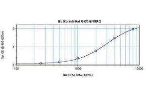 Usage: The applications listed have been tested for the unconjugated form of this product. Other forms have not been tested. ELISA: To detect Rat GRO-beta/MIP-2 by direct ELISA (using 100 μL/well antibody solution) a concentration of 0.25-1 μg/mL of this antibody is required. This biotinylated polyclonal antibody, in conjunction with compatible secondary reagents, allows the detection of at least 0.2-0.4 ng/well of recombinant Rat GRO-beta/MIP-2.. To detect Rat GRO-beta/MIP-2 by sandwich ELISA (using 100 μL/well antibody solution) a concentration of 0.25-1 μg/mL of this antibody is required. This biotinylated polyclonal antibody, in conjunction with Polyclonal Anti-Rat GRO-beta/MIP-2 (LS-C104776) as a capture antibody, allows the detection of at least 0.2-0.4 ng/well of recombinant Rat GRO-beta/MIP-2. Western Blot: To detect Rat GRO-beta/MIP-2 by Western Blot analysis this antibody can be used at a concentration of 0.1-0.2 μg/mL. Used in conjunction with compatible secondary reagents the detection limit for recombinant Rat GRO-beta/MIP-2 is 1.5-3 ng/lane, under either reducing or non-reducing conditions. -