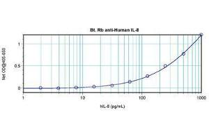 Usage: The applications listed have been tested for the unconjugated form of this product. Other forms have not been tested. ELISA: To detect Human IL-8 by direct ELISA (using 100 μL/well antibody solution) a concentration of 0.25-1 μg/mL of this antibody is required. This biotinylated polyclonal antibody, in conjunction with compatible secondary reagents, allows the detection of at least 0.2-0.4 ng/well of recombinant Human IL-8. To detect Human IL-8 by sandwich ELISA (using 100 μL/well antibody solution) a concentration of 0.25-1 μg/mL of this antibody is required. This biotinylated polyclonal antibody, in conjunction with Polyclonal Anti-Human IL-8 (LS-C104558) as a capture antibody, allows the detection of at least 0.2-0.4 ng/well of recombinant Human IL-8. Western Blot: To detect Human IL-8 by Western Blot analysis this antibody can be used at a concentration of 0.1-0.2 μg/mL. When used in conjunction with compatible secondary reagents, the detection limit for recombinant Human IL-8 is 1.5-3 ng/lane, under either reducing or non-reducing conditions. -