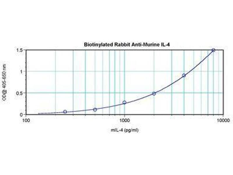 Usage: The applications listed have been tested for the unconjugated form of this product. Other forms have not been tested. ELISA: To detect Murine IL-4 by direct ELISA (using 100 μL/well antibody solution) a concentration of 0.25-1 μg/mL of this antibody is required. This biotinylated polyclonal antibody, in conjunction with compatible secondary reagents, allows the detection of at least 0.2-0.4 ng/well of recombinant Murine IL-4. To detect Murine IL-4 by sandwich ELISA (using 100 μL/well antibody solution) a concentration of 0.25-1 μg/mL of this antibody is required. This biotinylated polyclonal antibody, in conjunction with Polyclonal Anti-Murine IL-4 (LS-C104801) as a capture antibody, allows the detection of at least 0.2-0.4 ng/well of recombinant Murine IL-4. Western Blot: To detect Murine IL-4 by Western Blot analysis this antibody can be used at a concentration of 0.1-0.2 μg/mL. When used in conjunction with compatible secondary reagents the detection limit for recombinant Murine IL-4 is 1.5-3 ng/lane, under either reducing or non-reducing conditions. -