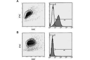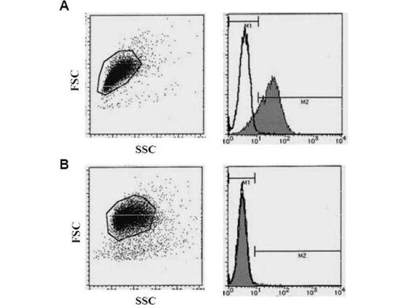 Flow cytometric analysis for floating cellsProtocol 1. 1) Wash the cells 3 times with washing buffer [PBScontaining 2% fetal calf serum (FCS) and 0. 1% NaN3]. 2) Add 10 µL of normal goat serum to the cell pellet after tapping. Mix well, and incubatefor 5 minutes at room temperature (20~25°C). 3) Add 30 µL of the FITC labeled anti Syndecan-1/CD138 monoclonal antibody (10-20µg/mL) diluted with the washing buffer. Mix well, and incubate for 30 minutes at roomtemperature (20~25°C). 4) Add 1 mL of the washing buffer followed bycentrifugation at 500 x g for 1 minute at roomtemperature (20~25°C). Remove supernatant by careful aspiration. 5) Resuspend the cells with 500 µL of the washing buffer and analyze by a flow cytometer. Protocol 2. We usually use Fisher tubes or equivalents as reaction tubes for all steps described below. 1) Wash the cells 3 times with washing buffer [PBS containing 2% fetal calf serum (FCS) and0. 1% NaN3]. 2) Resuspend the cells with PBS containing 25% normal goat serum and 0. 1% NaN3 (5x106cells/mL). 3) Add 20 µL of the non diluted FITC labeled anti-Syndecan-1/CD138 monoclonal antibodyinto each tube. 4) Add 50 µL of the cell suspension into each tube. Mix well, and incubate for 30 minutesat room temperature (20~25°C). 5) Add 1 mL of the washing buffer followed by centrifugation at 500 x g for 1 minute at roomtemperature (20~25°C). Remove supernatant by careful aspiration. 6) Resuspend the cells with 500 µL of the washing buffer and analyze by a flow cytometer. Flow cytometric analysis for whole blood cellsWe usually use Falcon tubes or equivalents as reaction tubes for all steps described below. 1) Add 20 µL of the non diluted FITC labeled anti-syndecan-1/CD138 monoclonal antibodyinto each tube. 2) Add 50 µL of whole blood into each tube. Mix well, and incubate for 30 minutes at roomtemperature (20~25°C). 3) Lyse with OptiLyse C (for analysis on Beckman Coulter instruments) or OptiLyse B (foranalysis on BD instruments), using the procedure recommended in the respective packageinserts. 4) Resuspend the cells with 500 ìL of the washing buffer [PBS containing 2% fetal calfserum (FCS) and 0. 1% NaN3] and analyze by a flow cytometer. Positive controls for Flow cytometry: KM3, RPMI8226, U226