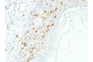 At least five CD1 genes (CD1a, b, c, d, and e) are identified. CD1 proteins have been demonstrated to restrict T cell response to non-peptide lipid and glycolipid antigens and play a role in non-classical antigen presentation. CD1a is a non-polymorphic MHC Class 1 related cell surface glycoprotein, expressed in association with Beta-2 microglobulin. Anti-CD1a labels Langerhans cell histiocytosis (Histiocytosis X), extranodal histiocytic sarcoma, a subset of T-lymphoblastic lymphoma/leukemia, and interdigitating dendritic cell sarcoma of the lymph node. When combined with antibodies against TTF-1 and CD5, anti-CD1a is useful in distinguishing between pulmonary and thymic neoplasms since CD1a is consistently expressed in thymic lymphocytes in both typical and atypical thymomas, but only focally in 1/6 of thymic carcinomas and not in lymphocytes in pulmonary neoplasms. Anti-CD1a is reported to be a new marker for perivascular epithelial cell tumor (PEComa).