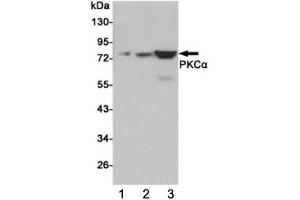 The stated application concentrations are suggested starting points. Titration of the PKC alpha antibody may be required due to differences in protocols and secondary/substrate sensitivity.\. Western blot: 1:1000