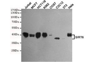 The stated application concentrations are suggested starting points. Titration of the SIRT6 antibody may be required due to differences in protocols and secondary/substrate sensitivity.\. Western blot: 1:500,ICC/IF: 1:100,Immunoprecipitation: suitable