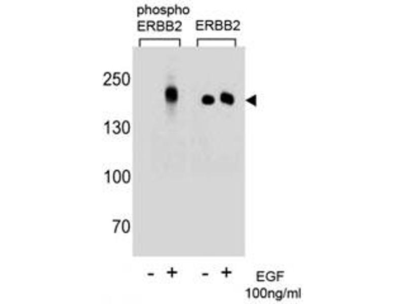 Titration of the p-ERBB2 antibody may be required due to differences in protocols and secondary/substrate sensitivity.\. Western blot: 1:4000,Immunofluorescence: 1:100,Dot blot: 1:500