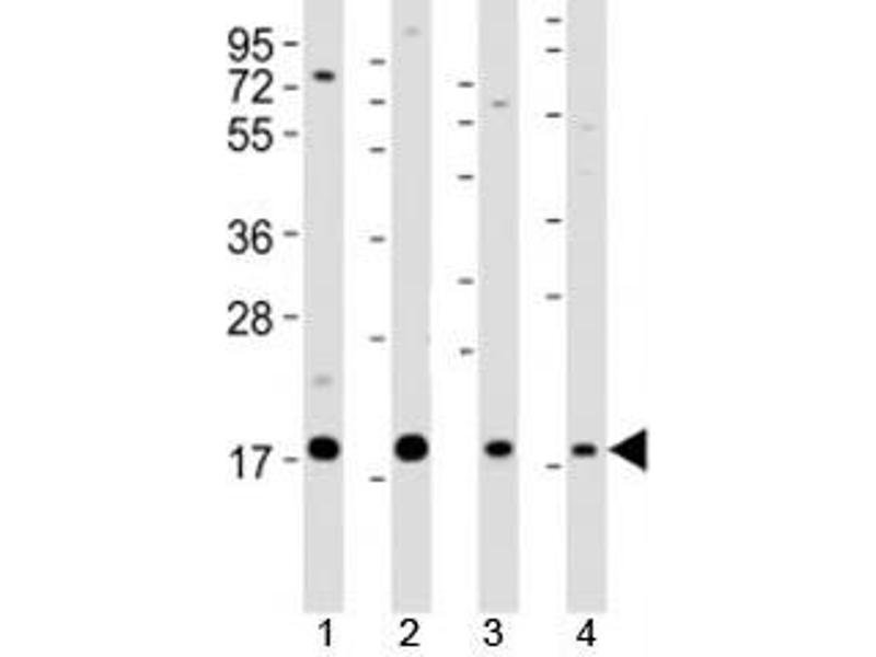 1. The 45 kDa precursor protein autocleaves into 27 kDa amino and 19 kDa carboxy fragments.\. Western blot: 1:1000-2000