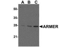 ELISA. Western Blot: ARMER antibody can be used for detection of ARMER at 0.5 to 2 μg/mL. Immunohistochemistry. Other applications not tested. Optimal dilutions are dependent on conditions and should be determined by the user.