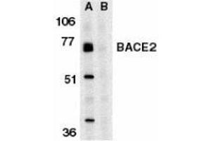 ELISA. Western Blot: BACE2 antibody can be used for detection of BACE2 at 0.5 to 1 μg/mL. Immunohistochemistry. Other applications not tested. Optimal dilutions are dependent on conditions and should be determined by the user.