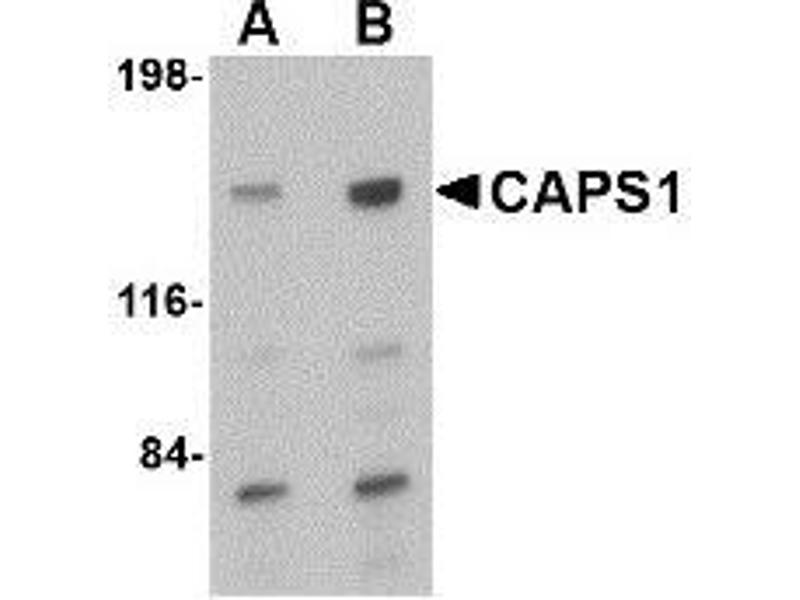 CAPS1 and its related protein CAPS2 encode novel neural/endocrine-specific cytosolic and peripheral membrane proteins. Both are essential components of the synaptic vesicle priming machinery and are required for the Ca2+-regulated exocytosis of secretory vesicles, CAPS-deficienct neurons contain no or very few fusion competent synaptic vesicles, causing a selective impairment of fast phasic transmitter release. CAPS1 acts at a stage in exocytosis that follows ATP-dependent priming, which involves the essential synthesis of phosphatidylinositol 4,5-bisphosphate and is thought to be a specific regulator of large dense-core vesicle fusion. Numerous isoforms of CAPS1 are known to exist, the lower molecular weight bands seen in the immunoblot image are likely to be these isoforms. This CAPS1 antibody is predicted to be specific to CAPS1 and not recognize CAPS2.Synonyms: CAPS, CAPS-1, CAPS1, Calcium-dependent activator protein for secretion 1, Calcium-dependent secretion activator 1, KIAA1121