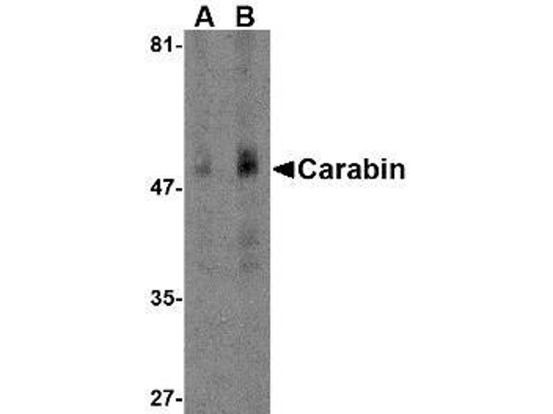 ELISA. Western Blot: Carabin antibody can be used for detection of Carabin at 1 - 2 μg/mL. Immunohistochemistry. Other applications not tested. Optimal dilutions are dependent on conditions and should be determined by the user.