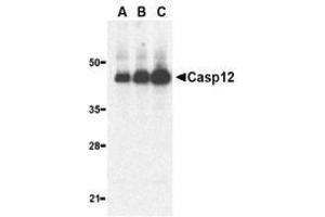 ELISA. Western Blot: Caspase-12 (large) antibody can be used for the detection of both thepropeptide and cleaved forms of caspase-12 at 0.5 to 2 μg/mL. Immunohistochemistry. Other applications not tested. Optimal dilutions are dependent on conditions and should be determined by the user.