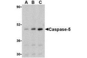 ELISA. Western Blot: Casp-5 antibody can be used for the detection of caspase-5 at 0.5 - 1 μg/mLDepending on cell lines or tissues used, other cleavage products may be observed. Immunocytochemistry.
