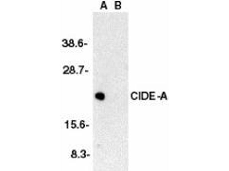 ELISA. Western Blot: CIDE-A antibody can be used for detection of CIDE-A at 1/1000 to 1/2000dilution. An approximately 23 kDa band can be detected. Immunohistochemistry. Other applications not tested. Optimal dilutions are dependent on conditions and should be determined by the user.