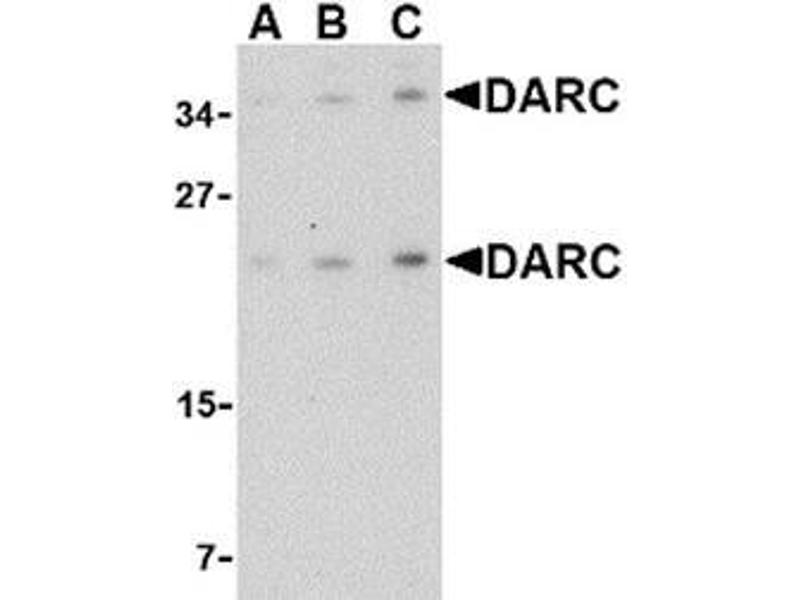DARC, also known as the Duffy antigen/chemokine receptor, is a seven-transmembrane protein homologous to the classical chemokine G-protein coupled receptors (GPCRs) with the exception of the motif required for G protein coupling. DARC can bind with high affinity several chemokines without transducing any signal, suggesting it may modulate the signals normally induced by these chemokines. Recently, DARC was found to interact with KAI1, a four transmembrane protein recently identified as a tumor metastasis suppressor protein. It is thought that tumor cells dislodged from the primary tumor and expressing KAI1 interact with DARC proteins expressed on vascular cells, transmitting a senescent signal to the tumor cells, while tumor cells that have lost KAI1 expression can proliferate and potentially give rise to metastases. At least three isoforms of DARC are known to exist.Synonyms: Duffy antigen/chemokine receptor, FY, Fy glycoprotein, GPD, Glycoprotein D, GpFy, Plasmodium vivax receptor