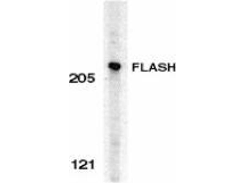 - FLASH antibody was raised against a synthetic peptide corresponding to amino acids near the carboxy-terminus of human FLASH which differ from those of mouse by one amino acid.