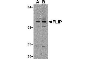 FLIP antibody was raised against a peptide corresponding to amino acids near the amino terminus of human FLIP The sequence is identical in all FLIP splice variants. FLIP recognizes all FLIP splice variants including FLIPa, b, and y.