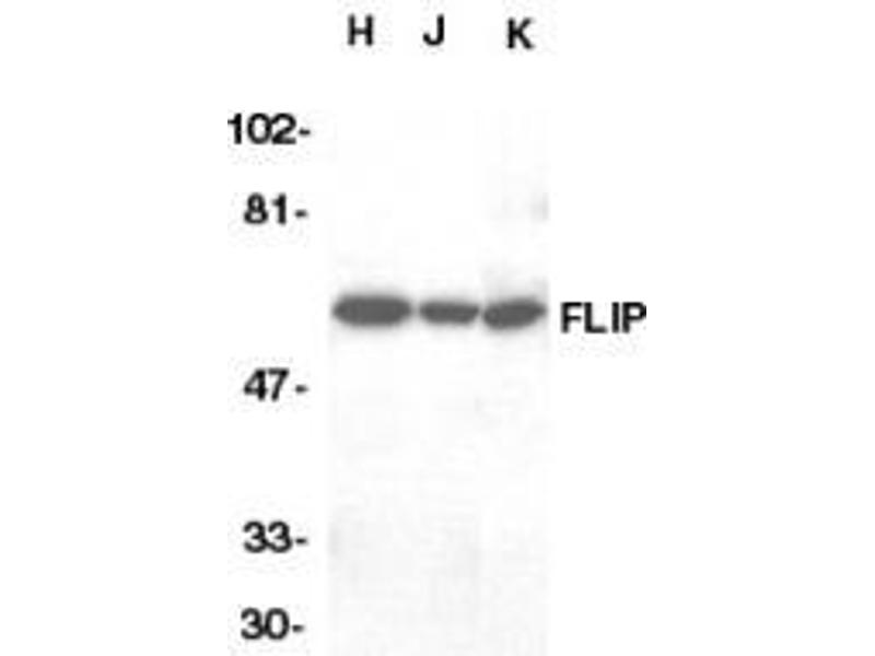 FLIP antibody was raised against a peptide corresponding to amino acids near the C-terminus of human FLIPaFLIPl form. Antibody recognizes the FLIPa only.