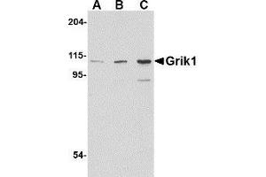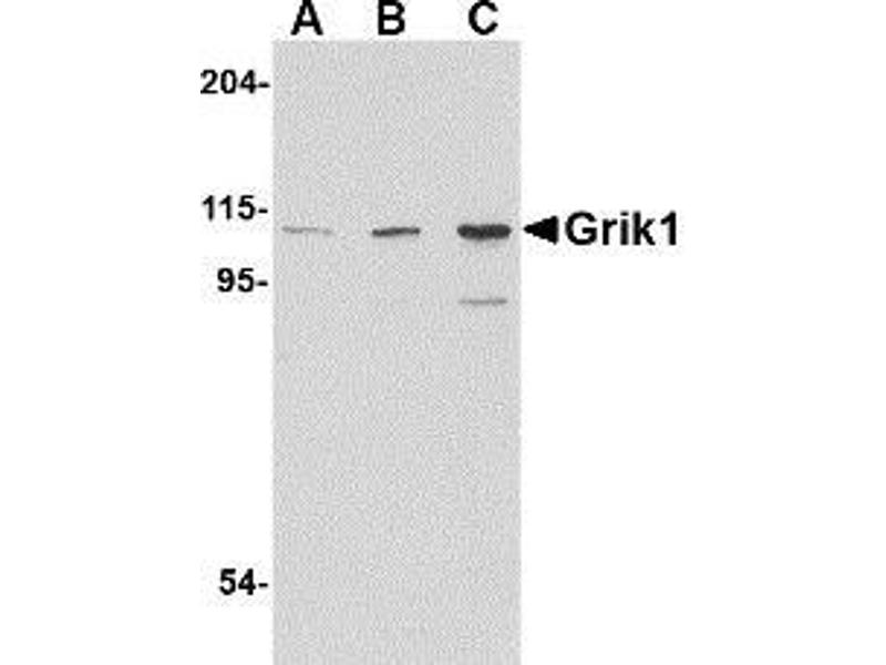 Glutamate receptors are the predominant excitatory neurotransmitter receptors in the mammalian brain and are activated in a variety of normal neurophysiologic processes. Grik1, also known as glutamate receptor 5, belongs to the kainate family of glutamate receptors, which are composed of four subunits and function as ligand-activated ion channels. Grik1 is expressed in GABAergic interneurons of the hippocampus and are thought to participate in the formation of various subtypes of kainate receptors with Grik2 and KA2. Stimulation of Grik1 leads to intracellular calcium release and activation of protein kinase C. Excessive activation has been associated with psychiatric, neurological and neurodegenerative diseases. Numerous isoforms of Grik1 are known to exist and may be subject to RNA editing within the second transmembrane domain, which is thought to alter the properties of ion flow.Synonyms: EAA3, Excitatory amino acid receptor 3, GRIK1, Glutamate receptor ionotropic kainate 1