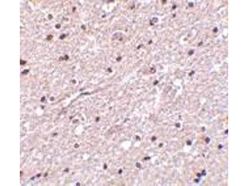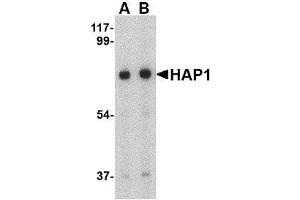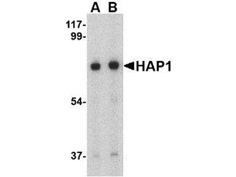 Huntington\'s disease (HD), a neurodegenerative disorder characterized by loss of striatal neurons, is caused by an expansion of a polyglutamine tract in the HD protein huntingtin. HAP1 was initially identified through a two-hybrid library screening, the binding of HAP1 to huntingtin correlated with the expansion of the polyglutamine tract. HAP1 also interacts with two cytoskeletal proteins (dynactin and pericentriolar autoantigen protein 1), suggesting that HAP1 may play a role in vesicular trafficking or organelle transport. HAP1 is also involved with the huntingtin-enhanced BDNF transport along the cellular microtubles. Attenuation of this process led to the loss of neurotrophic support and neuronal toxicity, which suggests that loss of this function might contribute to pathogenesis. Several alternatively spliced isoforms have been described for HAP1.Synonyms: HAP-1, HAP2, HLP1, Huntingtin-associated protein 1, Neuroan 1