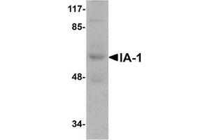 IA-1, also known as INSM1, is an essential five zinc-finger transcription factor that while initially identified from an insulinoma cDNA library, is expressed in the developing nervous system. Specifically, IA-1 is expressed as early as E9.5 in mice in the fore-, mid- and hindbrain, spinal cord, retina, and olfactory bulb. It is thought that IA-1 functions as a transcriptional repressor, and is a part of several signaling pathways including those of Notch and sonic hedgehog in addition to that of Ngn3 during pancreatic endocrine cell differentiation. IA-1 is also expressed in multiple tumors, including the majority of neuroendocrine tumors tested so far as well as nearly 100 % of all small cell lung carcinomas, indicating that IA-1 may be an important target in cancer therapy.Synonyms: Insulinoma-associated protein 1, Zinc finger protein IA-1