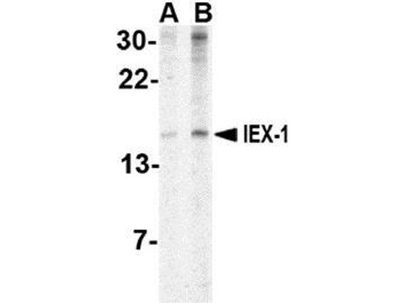 - IEX-1 is a stress inducible gene that is induced by ionizing radiation, ultraviolet radiation, and a variety of growth factors, i.e., FAS and TNF-a. IEX-1 is widely expressed in epithelial and endocrine tissues, as well as in vascular endothelium. It plays an important role in the regulation of cellular growth, cell death and oncogenesis. IEX-1 is precisely regulated by multiple transcription factors such as p53, NF-kappaB/rel, Sp1 and c-Myc, to ensure rapid and transient expression of IEX-1 in cells under a variety of stress conditions. IEX-1 is expressed as both a longer form (IEX1L) and a splice variant, designated IEX1S. It is localized to the nucleus and perinuclear region. Overexpression of IEX-1 facilitates apoptosis and cell cycle progression, whereas disruption of IEX-1 expression is associated with decreases in both apoptosis and cell cycle progression.Synonyms: DIF2, Differentiation-dependent gene 2 protein, GLY96, IEX-1, Immediate early protein GLY96, Immediate early response 3 protein, PACAP-responsive gene 1 protein, PRG1, Radiation-inducible immediate-early gene IEX-1