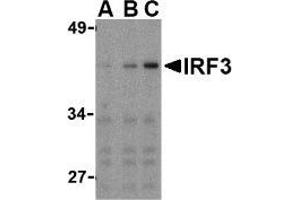Interferons (IFN)s are involved in a multitude of immune interactions during viral infections and play a major role in both the induction and regulation of innate and adaptive antiviral mechanisms (1 for review). During infection, host-virus interactions signal downstream molecules such as transcription factors such as IFN regulatory factor-3 (IRF3) which can act to stimulate transcription of IFN-alpha/beta genes. IRF3 is present in an inactive form in the cytoplasm of most cells (2). Following viral infection, IRF3 can be activated by IkappaB kinase-epsilon and TANK-binding kinase 1 (TBK1) (3,4), whereupon IRF3 translocates to the nucleus. IRF3 can also be activated by stimulation of toll-like receptor 3 (TLR3) by dsRNA (3,5). IRF3 exists as at least two distinct isoforms.Synonyms: IRF-3, Interferon regulatory factor 3