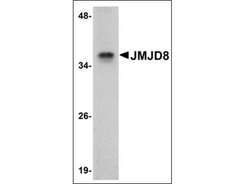 The jumonji domain-containing protein (JMJD) family is defined by the presence of the JmjC domain that is observed in several diverse species. While several JMJD proteins have been identified as being involved in chromatin regulation, histone demethylation and development, the function of JMJD8 has not been identified.Synonyms: JmjC domain-containing protein 8, Jumonji domain-containing protein 8