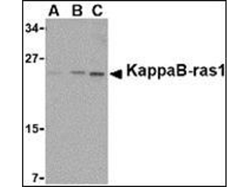 - KappaB ras1 antibody was raised against a 15 amino acid peptide from near the carboxy terminus of human KappaB ras1.