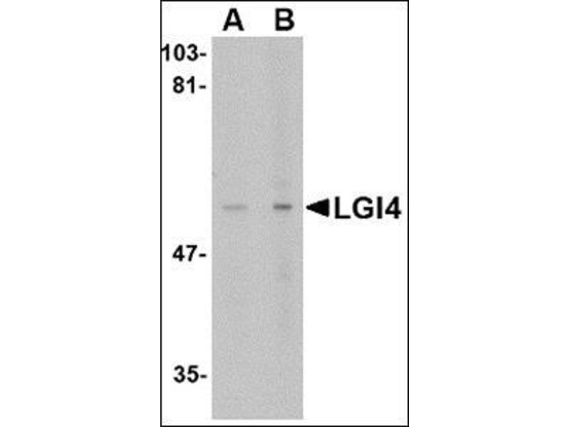 The leucine-rich, glioma inactivated gene 4 (LGI4) is a member of the LGI family in which LGI1 is the exemplar. The LGI family consists of four of highly related proteins containing leucine-rich repeats (LRRs) which are highly similar to other transmembrane signaling molecules and receptors. LGI1 has been identified as a candidate tumor suppressor gene for glioma and plays a role in autodominant lateral temporal epilepsy (ADTLE), an epileptic syndrome characterized by focal seizures with predominant auditory symptoms. Despite its high homology with LGI1 and similar pattern of expression, mutations in LGI4 have not been found to be associated with ADTLE. However, the LGI4 gene is located in a region linked to benign familial infantile convulsions. Further study revealed that a GC-to-AT polymorphism was correlated with childhood absence epilepsy. Other studies showed that decreasing LGI4 expression in cultured cells inhibits myelination, indicating that LGI4 may play a role in neural development. Two isoforms of LGI4 are known to exist.Synonyms: LGI1-like protein 3, LGI4, LGIL3, Leucine-rich glioma-inactivated protein 4, Leucine-rich repeat LGI family member 4