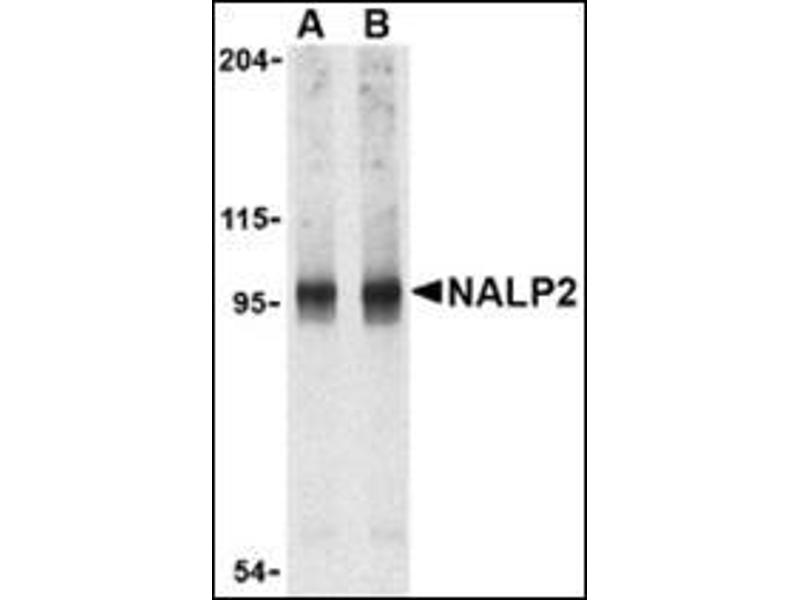 NALP2 belongs to a family of cytoplasmic proteins that have been implicated in cell responses to apoptotic and inflammatory stimuli (1). Unlike the prototypical NALP protein NALP1, NALP2 only contains a NACHT domain, leucine rich repeat (LRR), and pyrin-containing domain (PYD) (2). This protein interacts with the adapter protein ASC in addition to CARD8 and caspase-1 to form an inflammasome with high proIL-1Β-processing activity and is thought to function as a modulator of NF-ΚB and procaspase-1 activation in macrophages (2,3). It has also been suggested that NALP2, in addition to other NALP family members, can act as innate sensors of pathogens in a manner similar to the toll-like receptors (TLRs) (4). At least two alternatively spliced transcript variants encoding distinct isoforms have been found for NALP2.Synonyms: LRR and PYD domains-containing protein 2, NACHT, NBS1, NLRP2, PAN1, PYPAF2