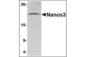 Nanos is a zinc-finger containing, RNA-binding protein that has been implicated in germ cell development in both invertebrates and vertebrates. In drosophila, Nanos represses apoptosis during development to ensure proper germ-line development. Unlike Nanos1 whose expression in mice is dispensable, the Nanos2 and Nanos3 proteins are required for germ cell development. Nanos2-null primordial germ cells (PGCs) die only in the male gonads and show no defects in females, while Nanos3-null PGCs are lost during the migration stage regardless of sex. Nanos2 and Nanos3 have distinct expression patterns during embryo development, suggesting that these two proteins do not have redundant functions. However, expression of Nanos2 can at least partially replace Nanos3 function in a Nanos3-null background. Nanos3 expression can not rescue Nanos2-null defects.Synonyms: MGC120114, NANOS1L, NOS3, Nanos homolog 3