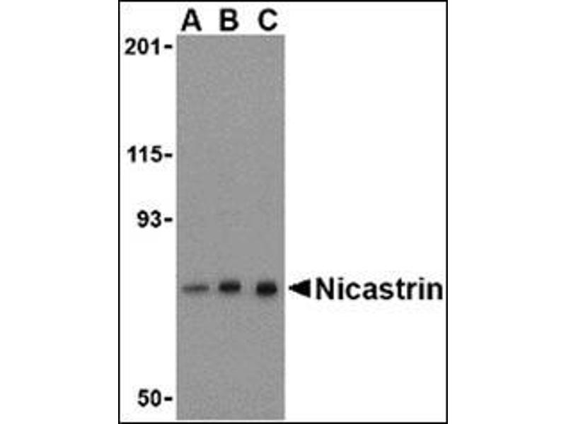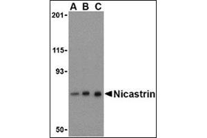 Nicastrin, in addition to presenilin, PEN2, and APH-1 forms the γ-secretase protein complex, a membrane-bound aspartyl protease that can cleave certain proteins at peptide bonds buried within the hydrophobic environment of the lipid bilayer. This cleavage is responsible for a key step in signaling from several cell-surface receptors and is thought to be required for the generation of the neurotoxic amyloid peptides that are central to the pathogenesis of Alzheimer's disease. Like the tumor necrosis factor-a-converting enzyme (TACE) and the b-site cleavage enzyme (BACE) protease families, γ-secretase will cleave the amyloid precursor protein (APP), but within the intramembrane region of APP, resulting in either the non-toxic p3 (from the α and γ cleavage site) or the toxic Aβ amyloid peptide (from the β and γ cleavage site). It is thought that accumulation of the Aβ peptide is the precursor to Alzheimer's disease. Nicastrin is also thought to be involved in cell proliferation and signaling, especially in regards to activation of Notch receptors as loss of Nicastrin expression results in mouse embryonic lethality.Synonyms: KIAA0253, NCSTN, UNQ1874/PRO4317